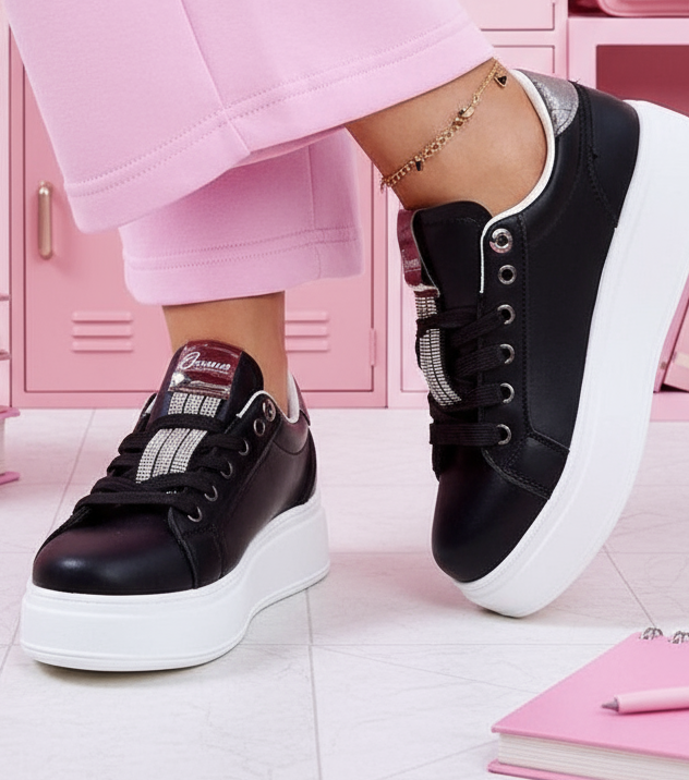 Black sneakers with Maurizia zirconia are made of high-quality rubber, which makes them not only stylish, but also comfortable and durable. Their low cut and rounded toe make them suitable for many different styles, both casual and more elegant. These shoes are the perfect combination of classic and modern - progressive design and trendy details make them an absolute hit of the season. Don't hesitate any longer and add them to your collection now! Outer material: faux suede leather